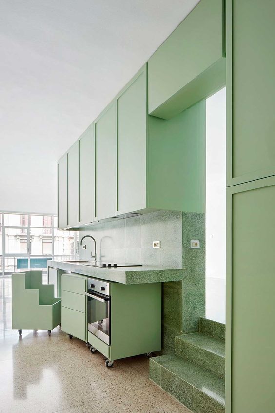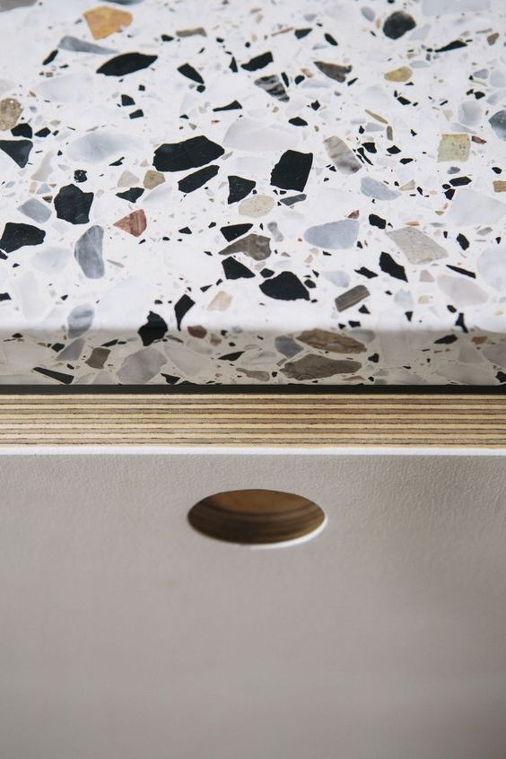 Accordingly, the countertops in the utility room and two bathrooms are crafted using a material from Smile Plastics—a company that repurposes waste such as chopping boards and milk bottles. The kitchen worktop is a terrazzo made from marble offcuts laid in pigmented cement.