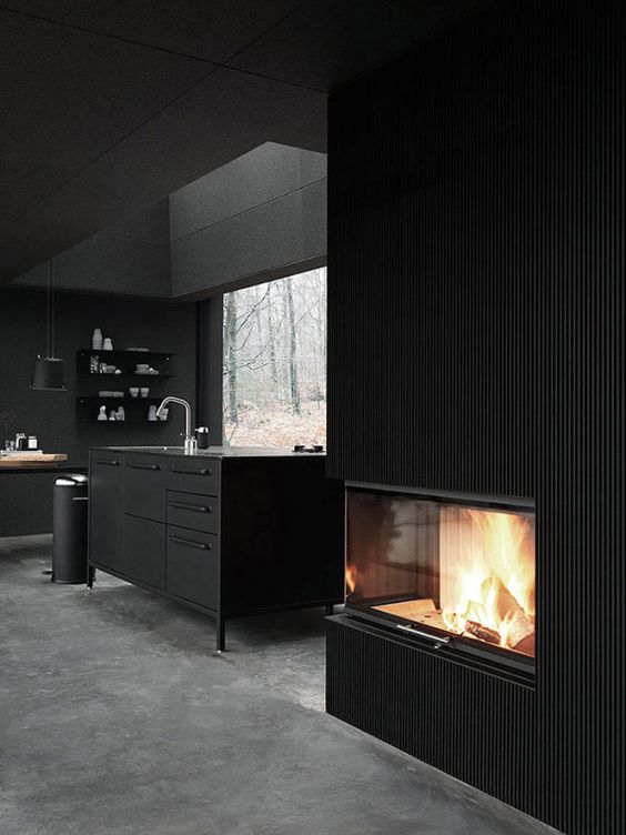 The designers take an analog approach when creating an operational living space, a machine for living typology, which begins and ends with function. “If you are cold you heat up the fireplace centrally positioned in the shelter for an equal distribution of heat; if you are warm you slide open the parallel windows to create natural air-condition. By locating the house in the deep deciduous woods, we are able to take advantage of the leaves as sun shading in the summer months. In the winter, when the trees lose their leaves, the building’s black exterior absorbs sunlight and with the fireplace, there is a reduction in fuel consumption”.